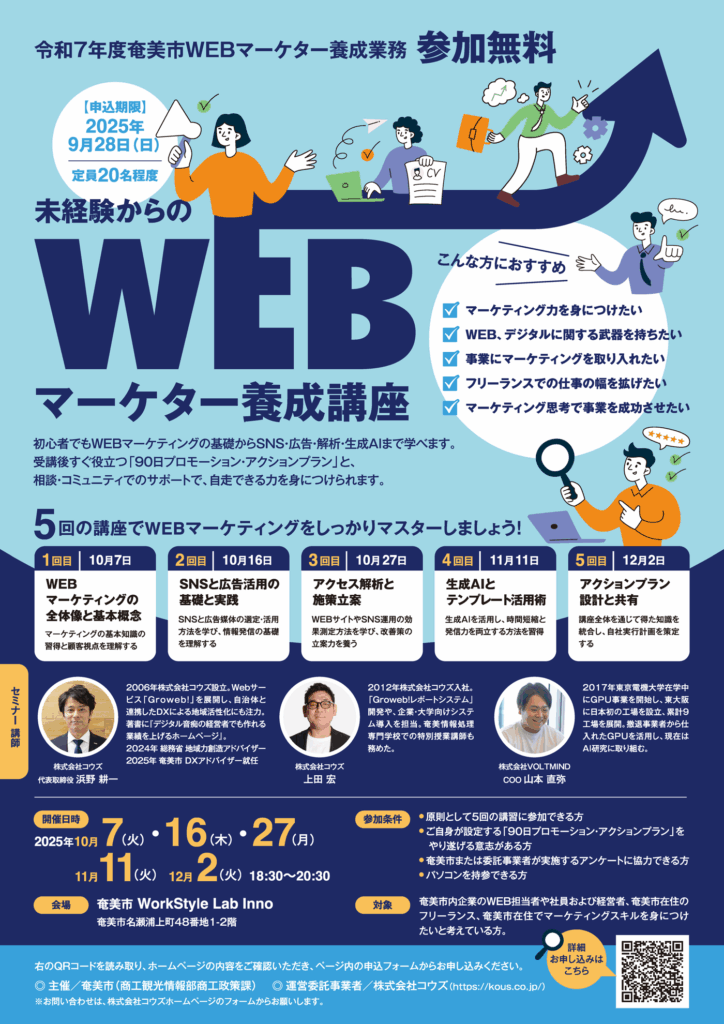 株式会社VOLTMIND(本社:大阪府大阪市、代表取締役:北森 聖士、以下「当社」)は、2025年11月11日、鹿児島県奄美市が主催し、株式会社コウズ(本社:大阪府大阪市、代表取締役:浜野 耕一、以下「コウズ」)が運営を行う、令和7年度 奄美市WEBマーケター養成業務『未経験からのWEBマーケター養成講座』に外部講師として登壇いたしました。