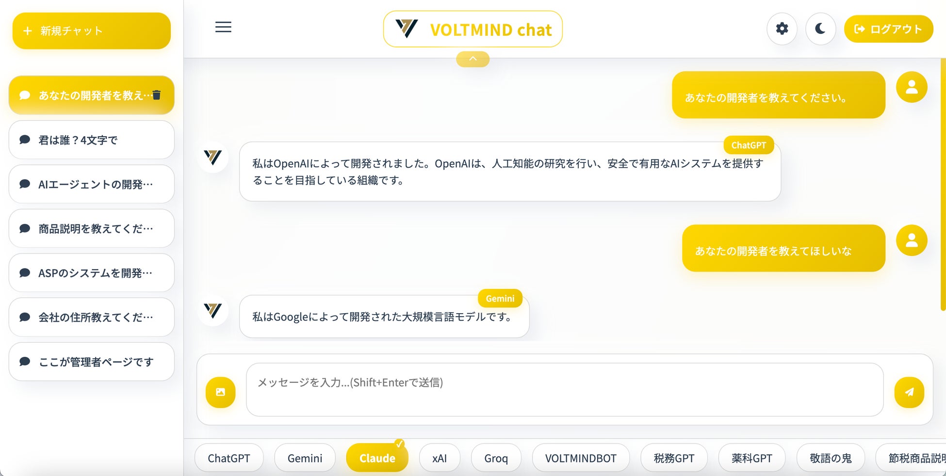 『VOLTMIND Chat』では、これらの手間を大幅に省き、1つの対話空間内で必要なAIモデルへスムーズに切り替えが可能です。これにより、生産性向上、操作性改善、ユーザーエクスペリエンスの向上を同時に実現します。